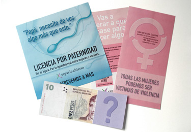 Un sistema de folletos de fuerte impacto, para distribuir en la calle, con soluciones como un billete cortado (paridad salarial varones-mujeres), símbolo femenino roto (violencia contra las mujeres) y otros temas que presentan las ideas de este partido político nuevo.