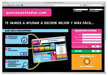 El primer sitio integral y específico para orientación vocacional y búsqueda de carreras universitarias. Una interfase clara para presentar con equilibrio las diferentes opciones de contenido, con una estética contemporánea adecuada al público adolescente y joven.